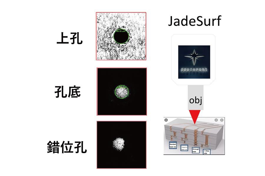 因應5G行動通訊高資料速率、減少訊號延遲及節省能源等需求,於是對於多層板電路板精度要求變得越來越高,在此同時行動裝置尺度越發輕薄,多層電路板中的連接孔洞也相應變小,為了滿足5G的需求,製作的精度及量測的準確性越發重要。其中又以肓孔上下孔的尺寸為最難被精確的量測。南方科技所開發的雷射掃描式共軛焦顯微技術,能清楚的量測出通孔,肓孔甚至是miss alignment。精度再現性遠勝於傳統AOI檢測技術。