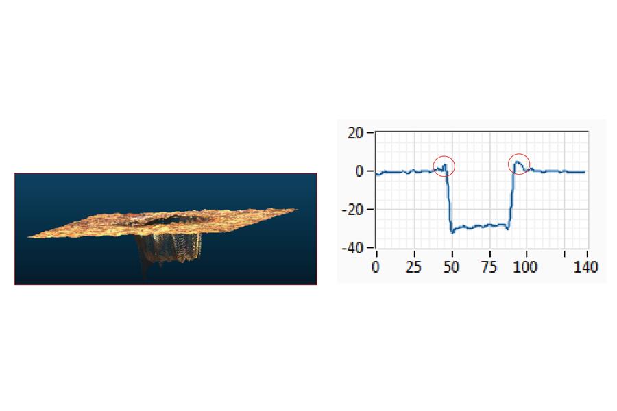 樣品為銅箔基板,左側為白光照明ROI所量測的影像,孔底受到景深影響,影像模糊且難以準確量測。右側為共軛焦影像,孔底影像不受前景影像,單層呈現清析可精確量測。除此之外亦提供三維影像及資訊。
