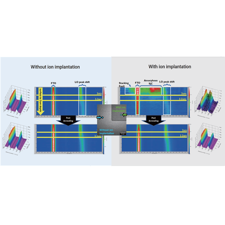 ▪ Effectively reflect the intrinsic property of WBG materials ‒ stress distribution on surface and in depth ▪ Good for monitor the stress distribution and polytype uniformity of SiC substrate, homogeneous and heterogeneous epi wafer, and device process review